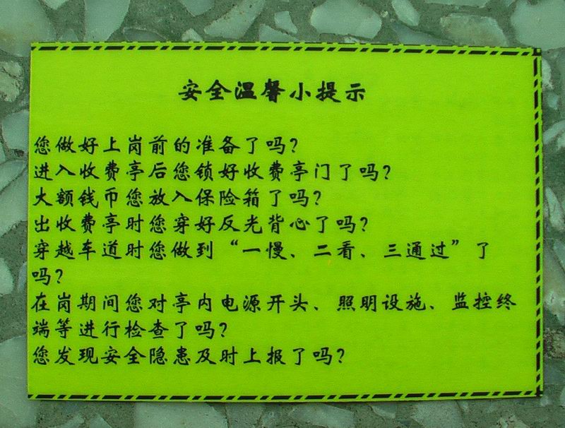 該站首先召開(kāi)了專題會(huì),精心組織,周密安排,營(yíng)造濃厚的“安全生產(chǎn)月”活動(dòng)氛圍;其次是形式多樣,務(wù)求實(shí)效。利用安全知識(shí)、安全提示卡、安全知識(shí)小測(cè)試等形式,普及安全生產(chǎn)常識(shí)。三是做好安全生產(chǎn)隱患自查自改工作。站安全領(lǐng)導(dǎo)小組集中對(duì)站內(nèi)的收費(fèi)、監(jiān)控、機(jī)電設(shè)施等重點(diǎn)區(qū)域進(jìn)行了安全排查,針對(duì)發(fā)現(xiàn)的問(wèn)題進(jìn)行了整改。四是深化班組長(zhǎng)在崗期間安全生產(chǎn)負(fù)責(zé)制。實(shí)施班組安全檢查制,每天由班組負(fù)責(zé)上崗期間收費(fèi)亭、收費(fèi)廣場(chǎng)的安全檢查,填寫(xiě)《班組安全檢查記錄表》,做到了安全工作與業(yè)務(wù)工作的有效結(jié)合。( 110國(guó)道沙城收費(fèi)站 王輝)