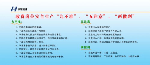 為了增強職工的安全生產(chǎn)意識,切實將安全生產(chǎn)落實到收費工作中,東花園收費站組織職工召開了安全生產(chǎn)座談會,通過總結(jié)收費工作中存在的安全隱患,大家群策群力,共同研究編制了易懂、好記又便于操作的《收費崗位安全生產(chǎn)“九不準(zhǔn)”、“五注意”和“兩做到”》,要求全體職工必須熟練背會,嚴(yán)格操作,使安全規(guī)范真正扎根在每個職工的心里,落實在每個職工的行動上。內(nèi)容包含了交接班、疏導(dǎo)車輛、收費過程、非正常處理等各方面應(yīng)該注意且必須遵守的安全規(guī)定。站內(nèi)請專業(yè)人員將此項規(guī)定做成了宣傳展板,懸掛在站區(qū)醒目位置,時刻提醒收費人員在上崗期間要嚴(yán)格執(zhí)行“九不準(zhǔn)”“五注意”“兩做到”。